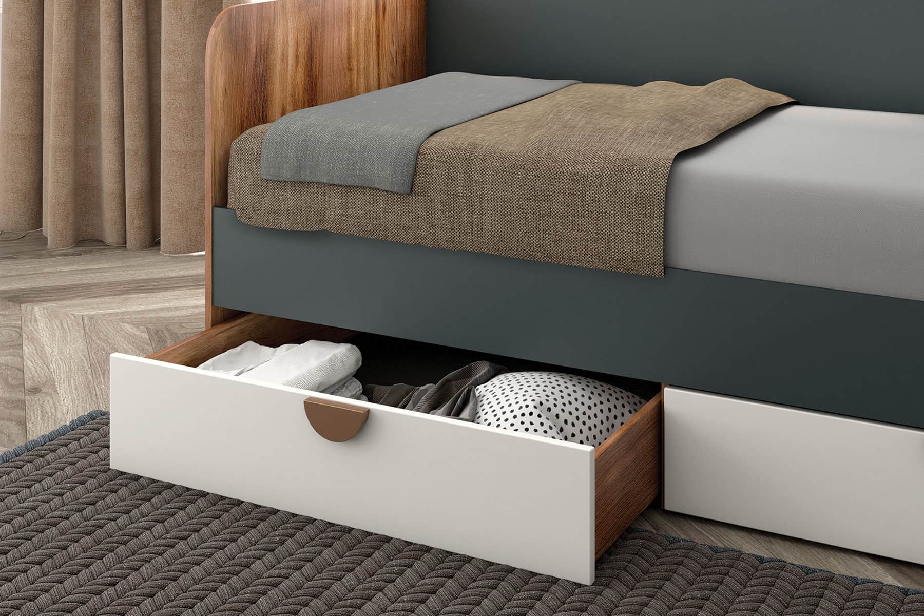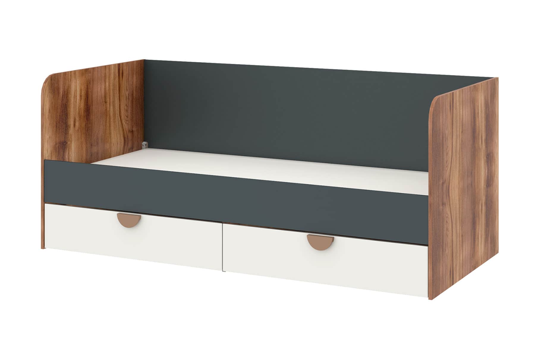 Кровать дополнена просторным ящиком для хранения, который выдерживает нагрузку до 25 кг, на шариковых направляющих с механизмом плавного закрывания, обеспечивающим удобство и безмолвность в использовании. Декоративные пластиковые ручки цвета меди добавляют изделию нотки элегантности. Корпус в оттенке "Дуб Барокко янтарный" подчеркивает тёплый и уютный дизайн.