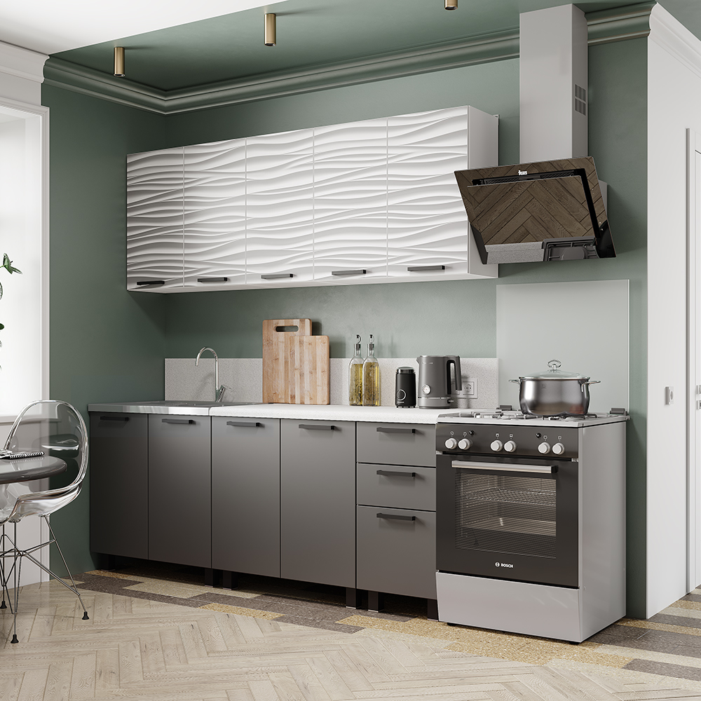 Верхние фасады выполнены в спокойном белом цвете, а нижние модули украшены теплой коричнево-бежевой фотопечатью . Контраст холодного серого и природных оттенков делает интерьер по-настоящему домашним и гармоничным.