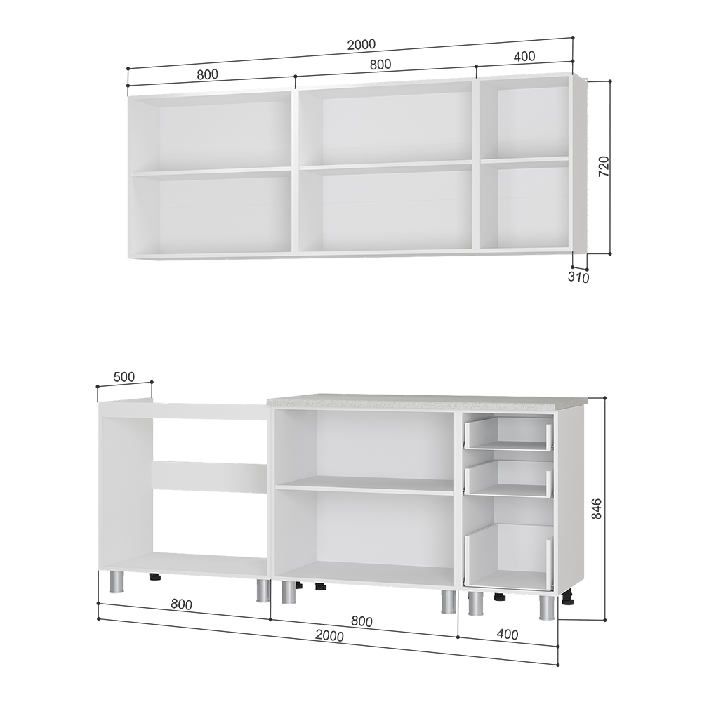 · Нижний ряд: Модули 8РК1, 4РК3, 8МК1 (общая ширина 2000 мм, высота 846 мм, глубина 600 мм). Включает столешницу.