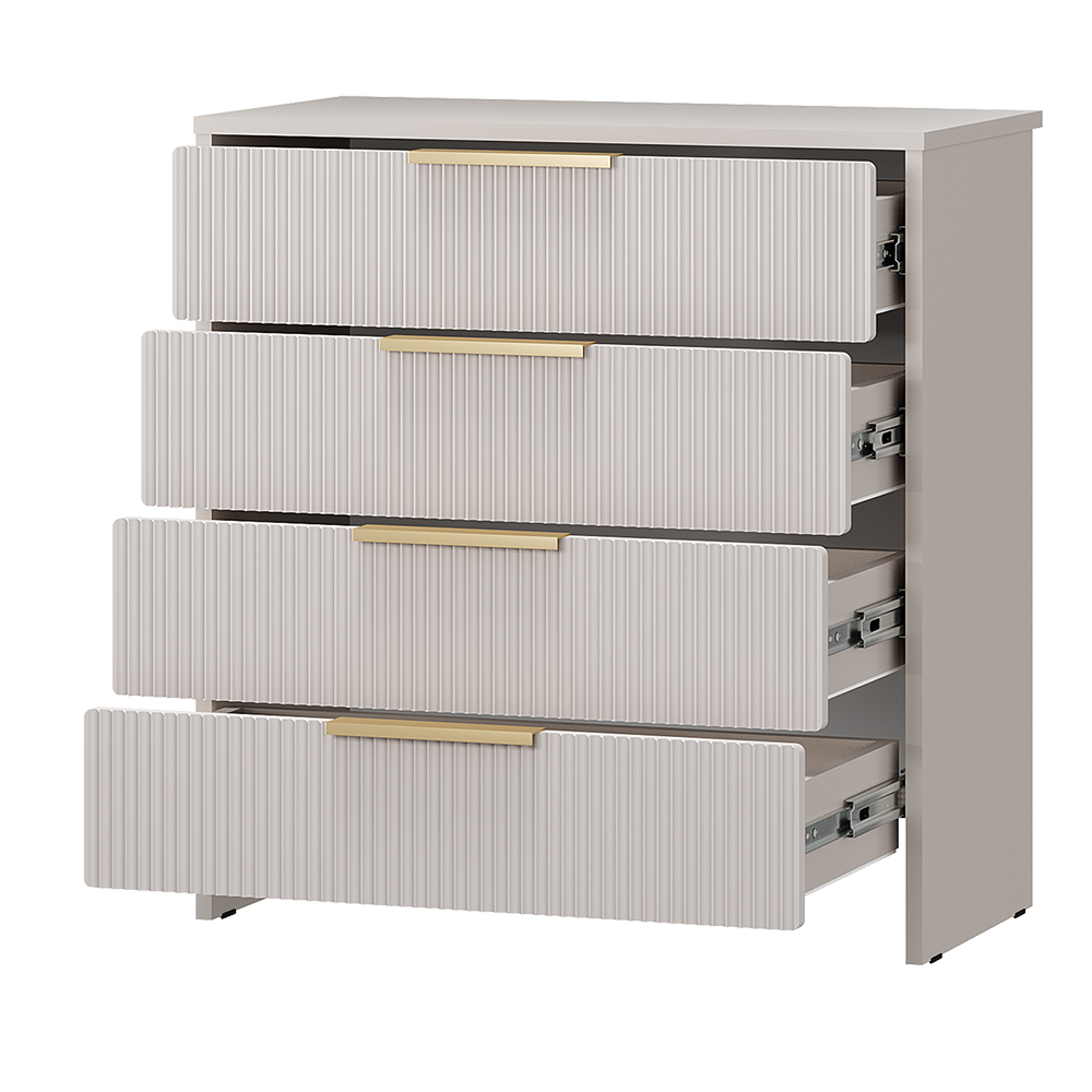 Лаконичный дизайн и отсутствие лишних деталей облегчают уход за комодом и делают его универсальным дополнением любого интерьера. Нежные оттенки фасада «айриш» и корпуса «кашемир» создают атмосферу уюта, а элегантная фрезеровка на фасаде добавляет модели изысканности и подчеркивает текстуру МДФ.