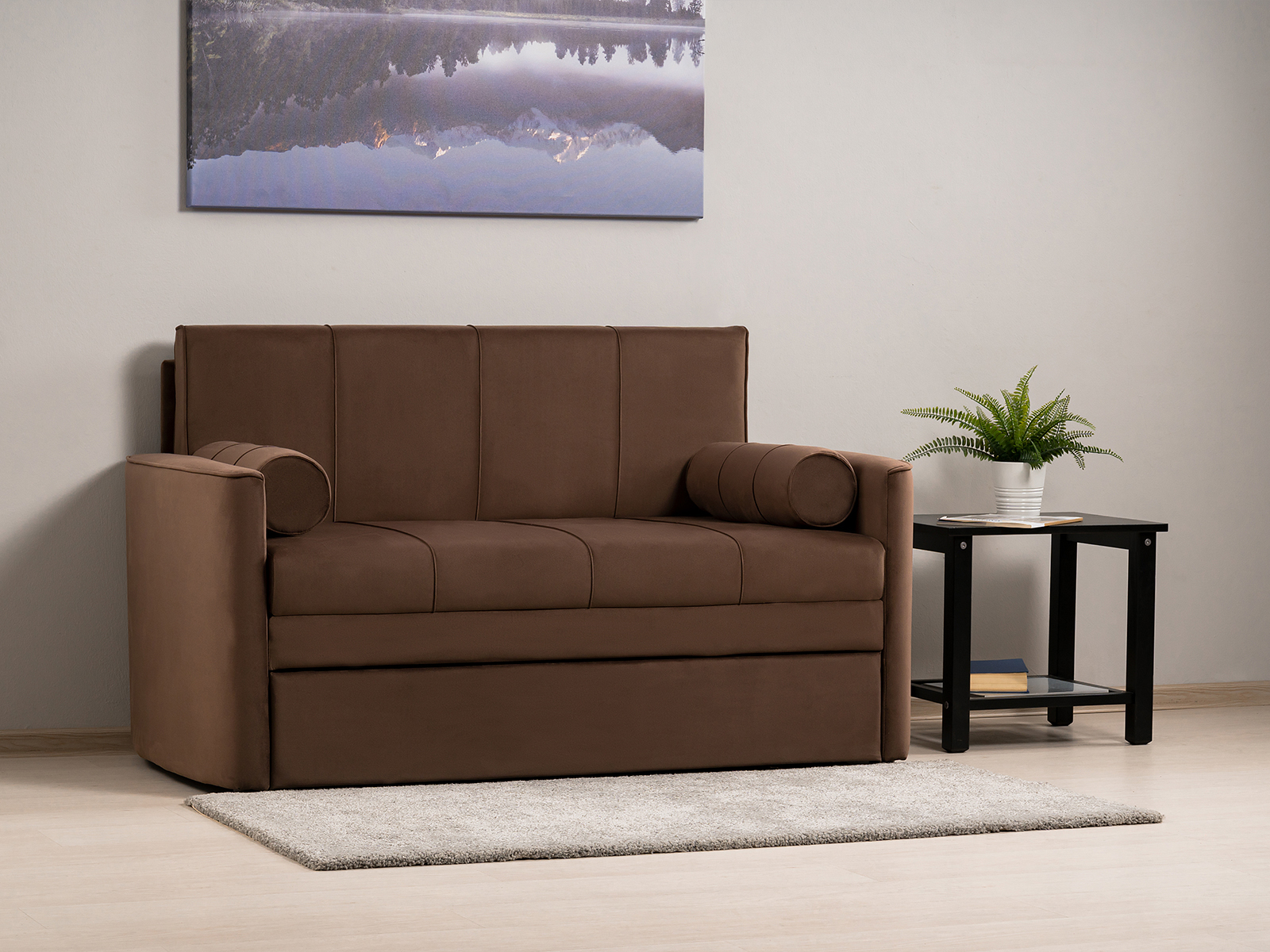 Диван-кровать Мелани Р (120) - компактный современный диванчик. Скругленные подлокотники с кантами подчеркивают эргономичность модели. Простой и надежный механизм трансформации на каждый день обеспечит удобным спальным местом ребенка или подростка. Может использоваться в качестве гостевого спального места для взрослого. Размер сп. места 195 х 120 см, есть небольшой бельевой ящик. Диван выполнен в мягком фактурном велюре. "Пальчиковый эффект" на ткани обивки выражен средне. Опоры - цвет черный, круглые, высота 25 мм., выполнены из высококачественного пластика. Прочность конструкции ножек обеспечена ребрами жесткости и внутренним креплением под фурнитуру.