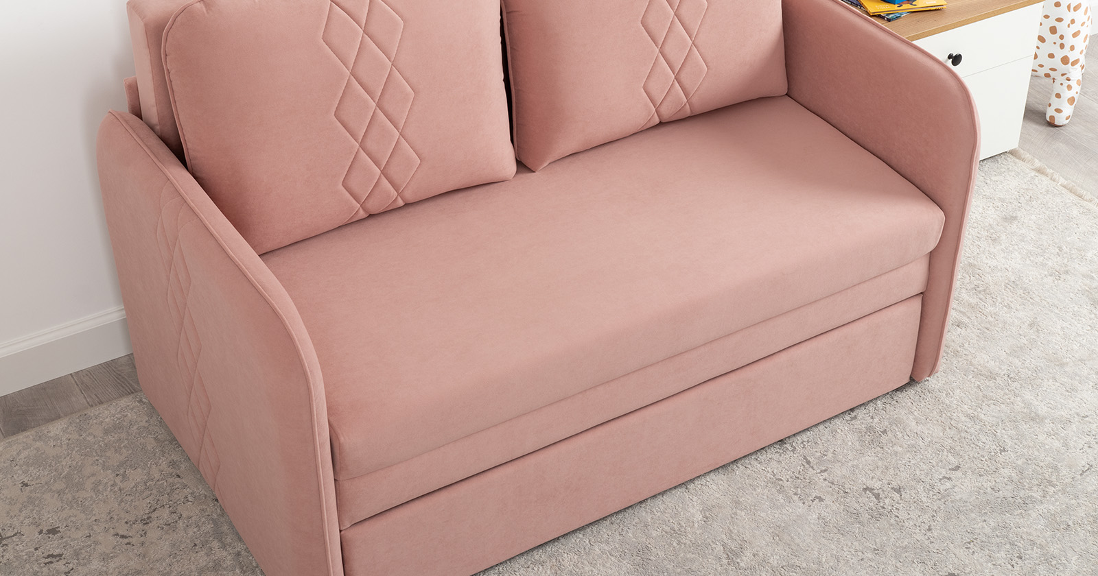Стильный и практичный дизайн: Лаконичная форма и изящная декоративная отстрочка, подчеркивающая фактуру роскошного велюра, позволяют дивану гармонично вписаться как в детскую, так и в современную гостиную.