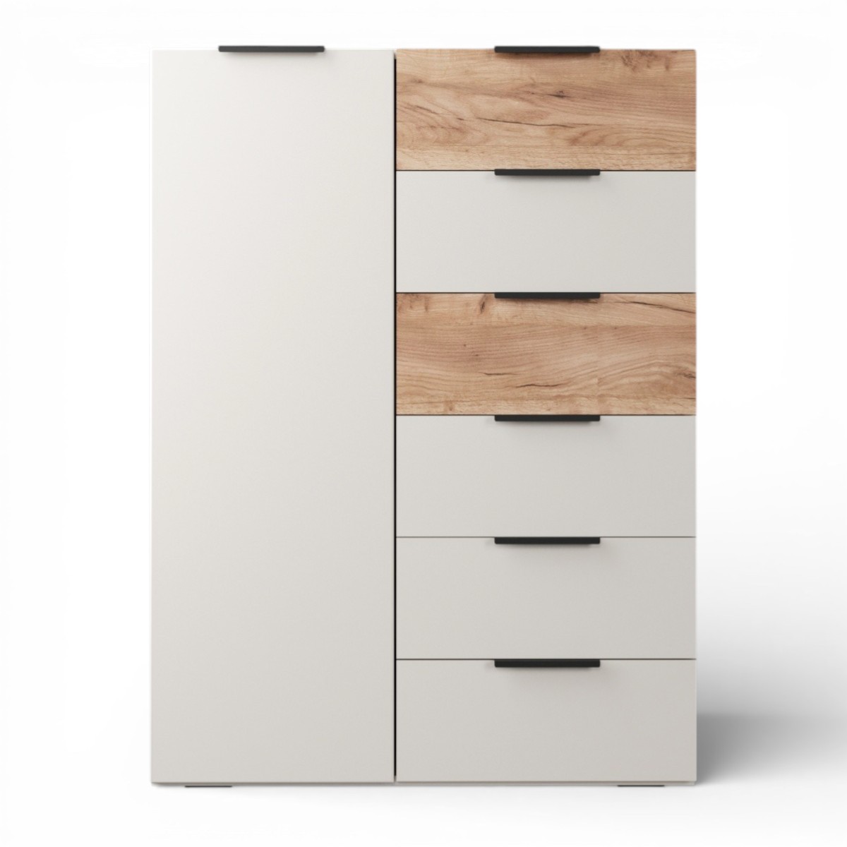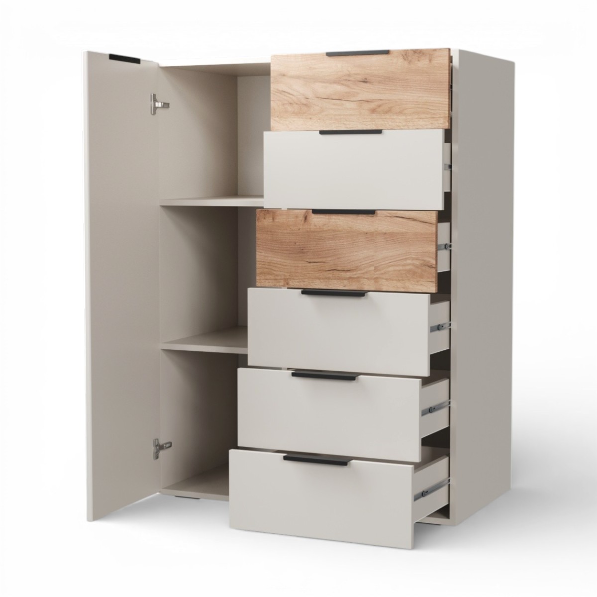Элегантный комод Севиль с комбинированной отделкой: корпус в цвете Кашемир и фасады под натуральное дерево Дуб Крафт. Модель оснащена шестью просторными выдвижными ящиками на надежных роликовых направляющих и функциональным отсеком с дверцей и внутренними полками. Идеальное решение для хранения вещей в спальне, гостиной или прихожей. Сочетает в себе лаконичный дизайн и высокую вместительность.